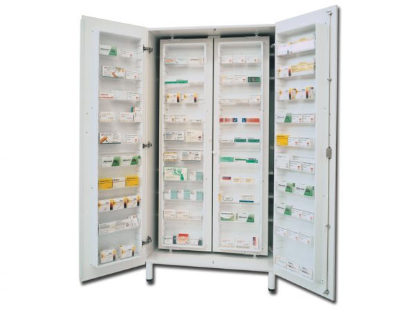 – 2 ante esterne munite di serratura, con rotazione 180° e 10 scomparti per farmaci ciascuna
